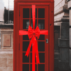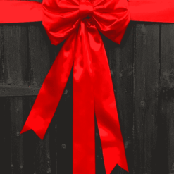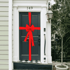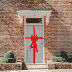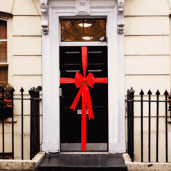 We supply a matching satin 4-inch wide ribbon to wrap your door. This is a high-quality satin ribbon with a beautiful sheen to match the bow. Wrap your door the way you would tie a giant present, tie the ribbon taut on the front of the door and then, using the ties on the reverse of the bow, tie this to the ribbon tightly, trimming any excess ribbon. It shouldn’t take longer than 5 minutes to transform your door for Christmas or a decorative finish for an entrance.