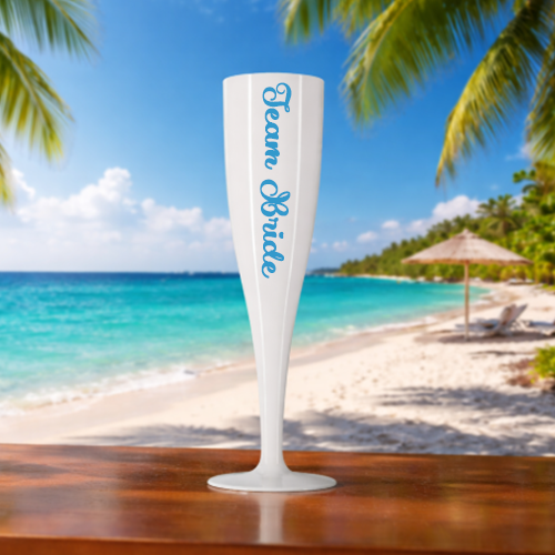 With its tall, tapered silhouette and glossy white finish, this reusable champagne glass brings a touch of sophistication to any celebration. Personalise it with your custom text, name, or logo in a stylish vinyl font – a brilliant way to commemorate a special occasion or showcase your brand in a memorable, sustainable way. The vinyl print adds a premium, bespoke touch that transforms each glass into a unique keepsake.